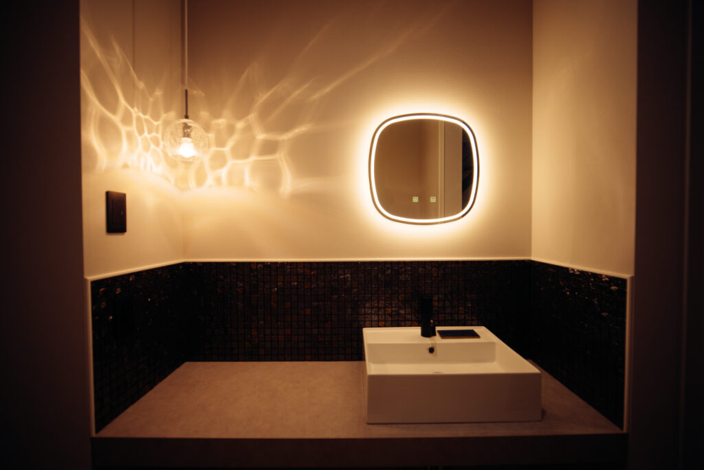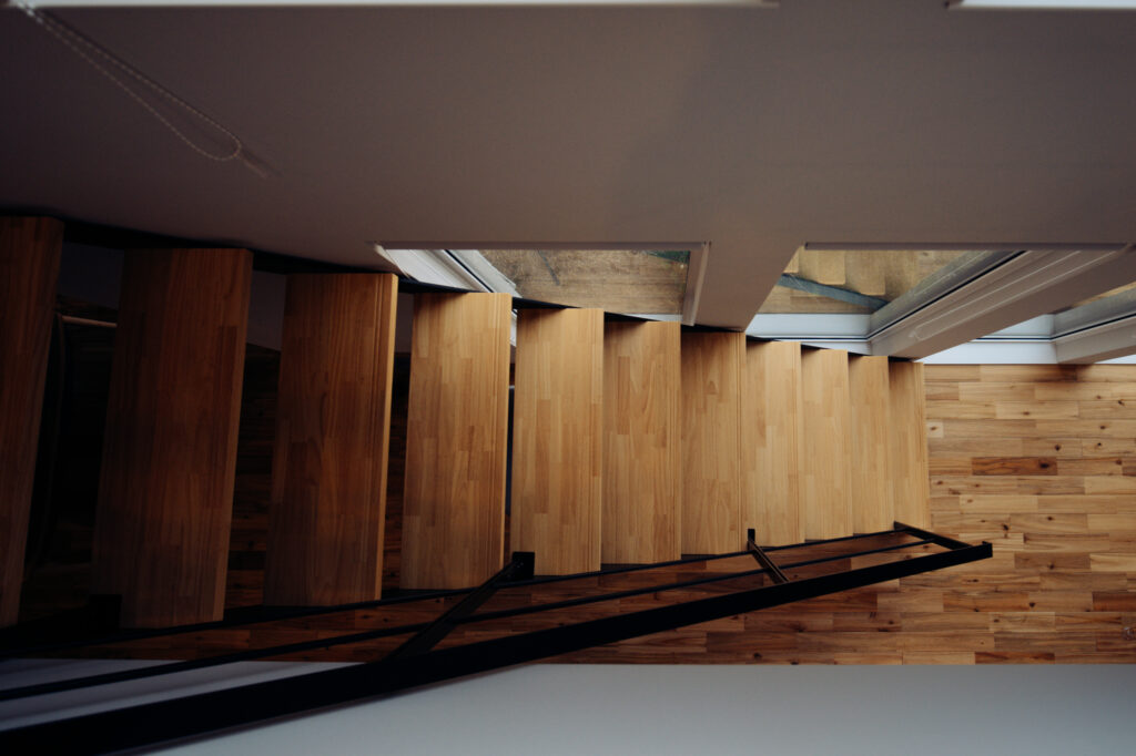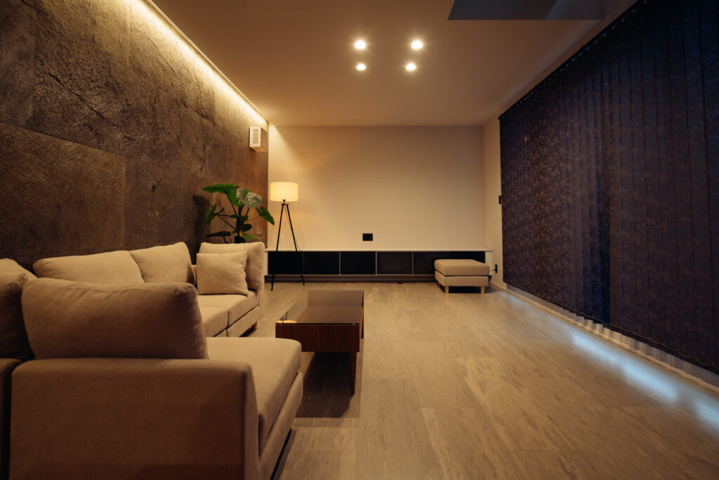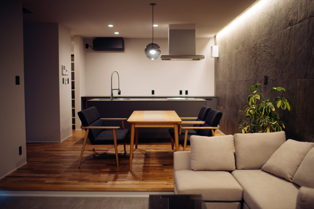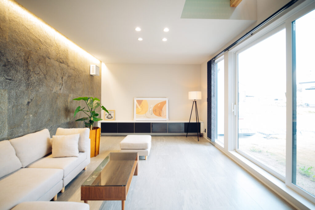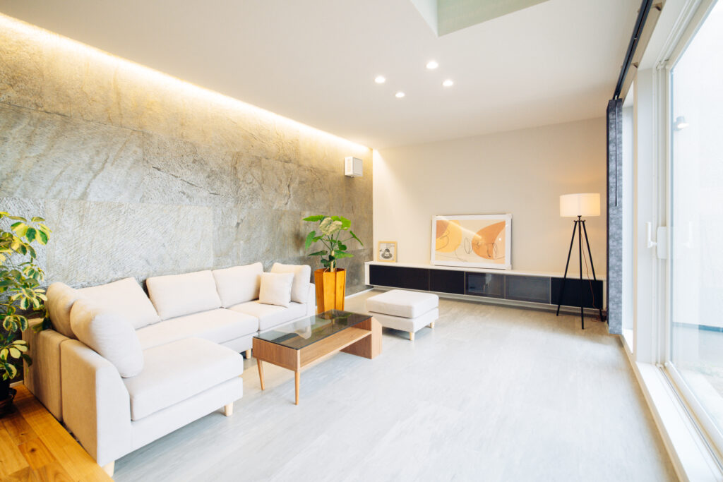 三面正面に木目のアクセントが特徴的な佇まい。暮らしやすいナチュラルモダンベースでありながら、LDKはダウンフロアやストーンタイルで非日常感も演出。さらに階段吹き抜けと格子床からの採光、L型プランを生かした光庭と一体的に繋がる空間美が特徴のスタンダードハウスです。